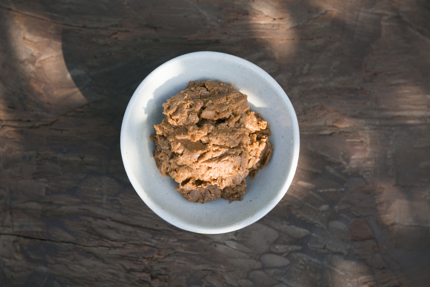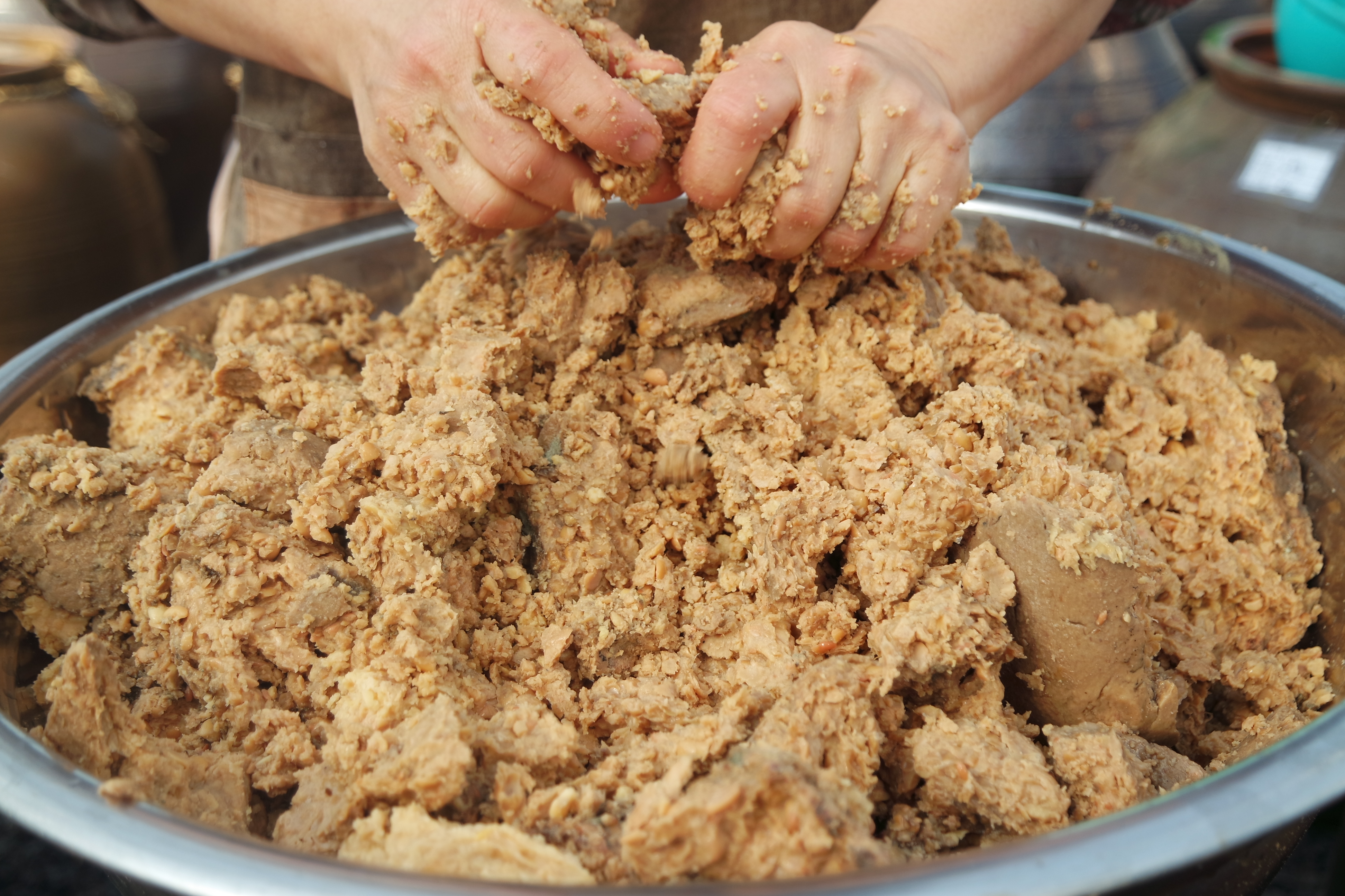 9. 건져낸 메주4덩이에 삶은콩 20%분량과 메주가루, 고추씨, 간장으로 잘 버무려 준비된 항아리에 꼭꼭 눌러 담습니다.