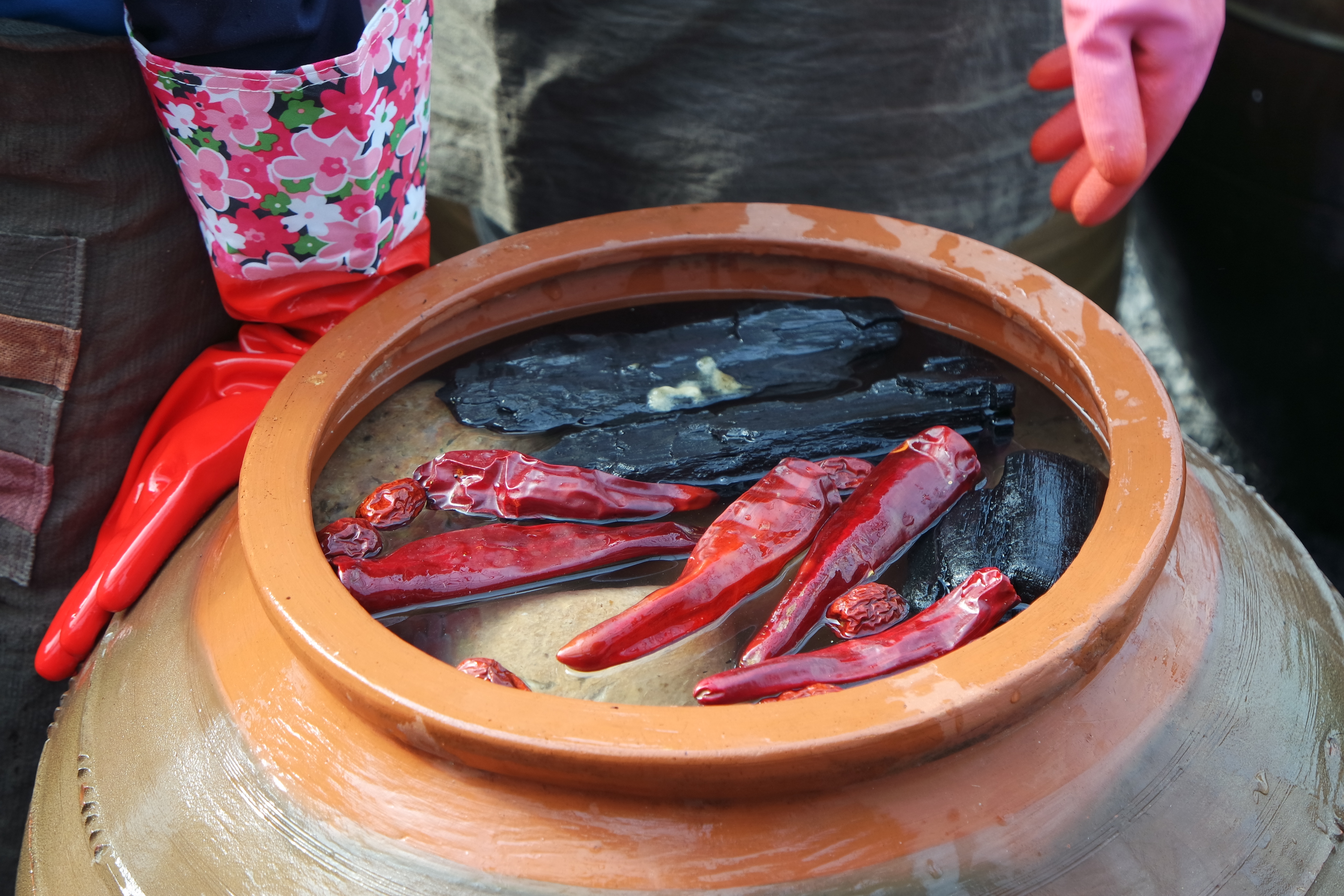 3. 항아리는 볏짚에 불을 붙이고 거꾸로 세워 불을 피워 연기가 밖으로 새어나가면 흠이 있는 것이므로 잘 살피고 항아리는 깨끗이 씻어 소독하여 준비합니다. 소독할 때 숯을 빨갛게 피우고 그 위에 꿀 한숟가락 얹어 소독하면 잡균까지 잡을 수 있습니다.